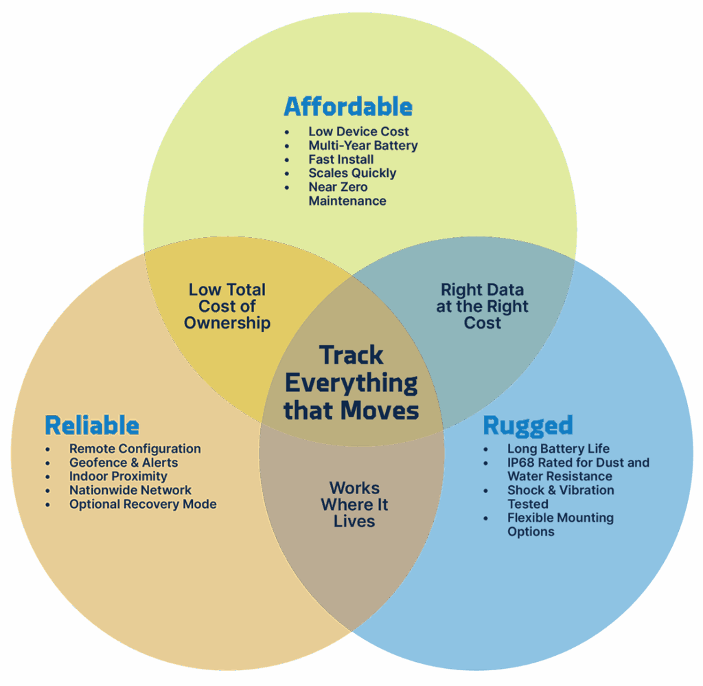 Modern cellular IoT networks, especially LTE-M, were built for battery-powered devices that check in on motion and on a light daily cadence. Coverage now matches where non-powered assets actually live: yards, public roads, and customer facilities. Devices can sleep efficiently between updates, which reduces field visits and extends life. That is what makes broad deployment practical.